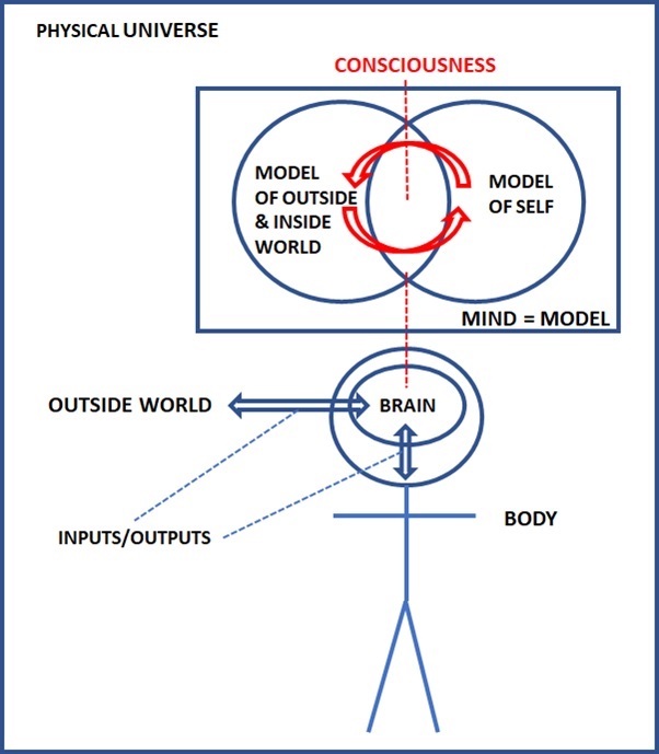 As illustrated above, the brain interacts with the outside world and inside world (body) through well understood physiological mechanisms. I understand the mind to be a very complex information system which models the world (outside and inside) via a neuronal network in the same sort of way that complex simulation software runs on computer hardware. So mind is entirely information, or if you like, information processing. An important part of the mind model (in humans at least) is a model of the self which has evolved for clear survival values. Consciousness is an emergent property of the mind model which arises from the recursive interaction of the self model with the model as a whole.
